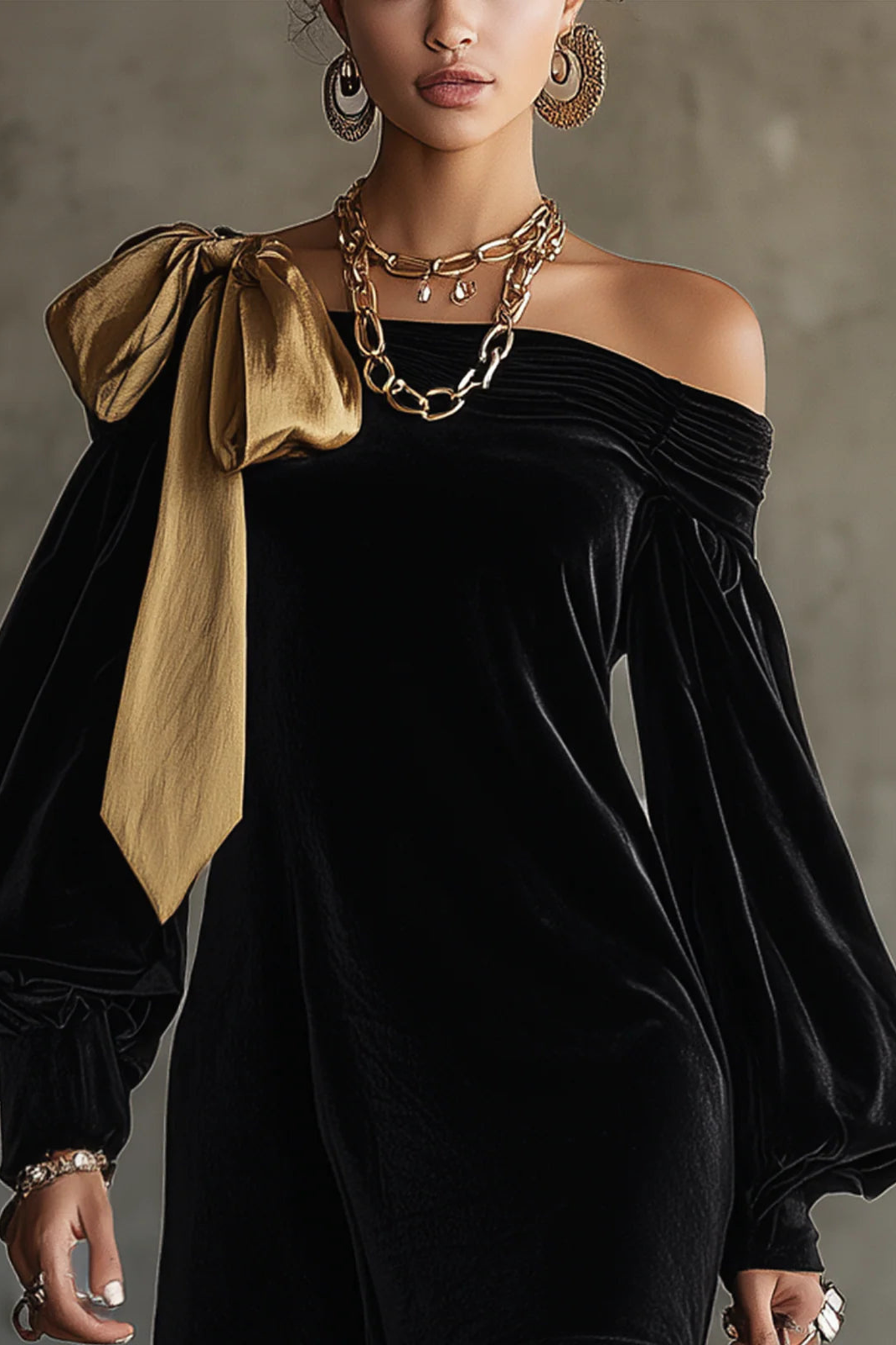 A striking mini dress crafted with a luxurious mix of black velvet and gold satin patchwork, designed to create a bold and elegant contrast. The off-the-shoulder neckline highlights the shoulders beautifully, while the fitted silhouette enhances your figure with a sleek, glamorous finish. Rich in texture and style, this dress is made to turn heads.