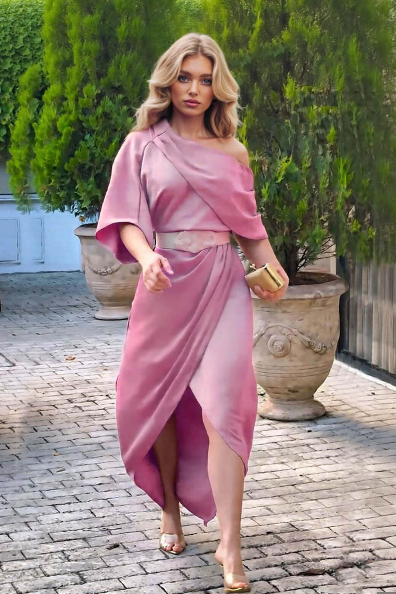 Crafted from luxurious satin, this maxi dress showcases an elegant ruched design that flatters the silhouette while adding a soft, graceful texture. The irregular neckline and flowing drape create a refined yet modern charm, making it perfect for women who appreciate understated sophistication.