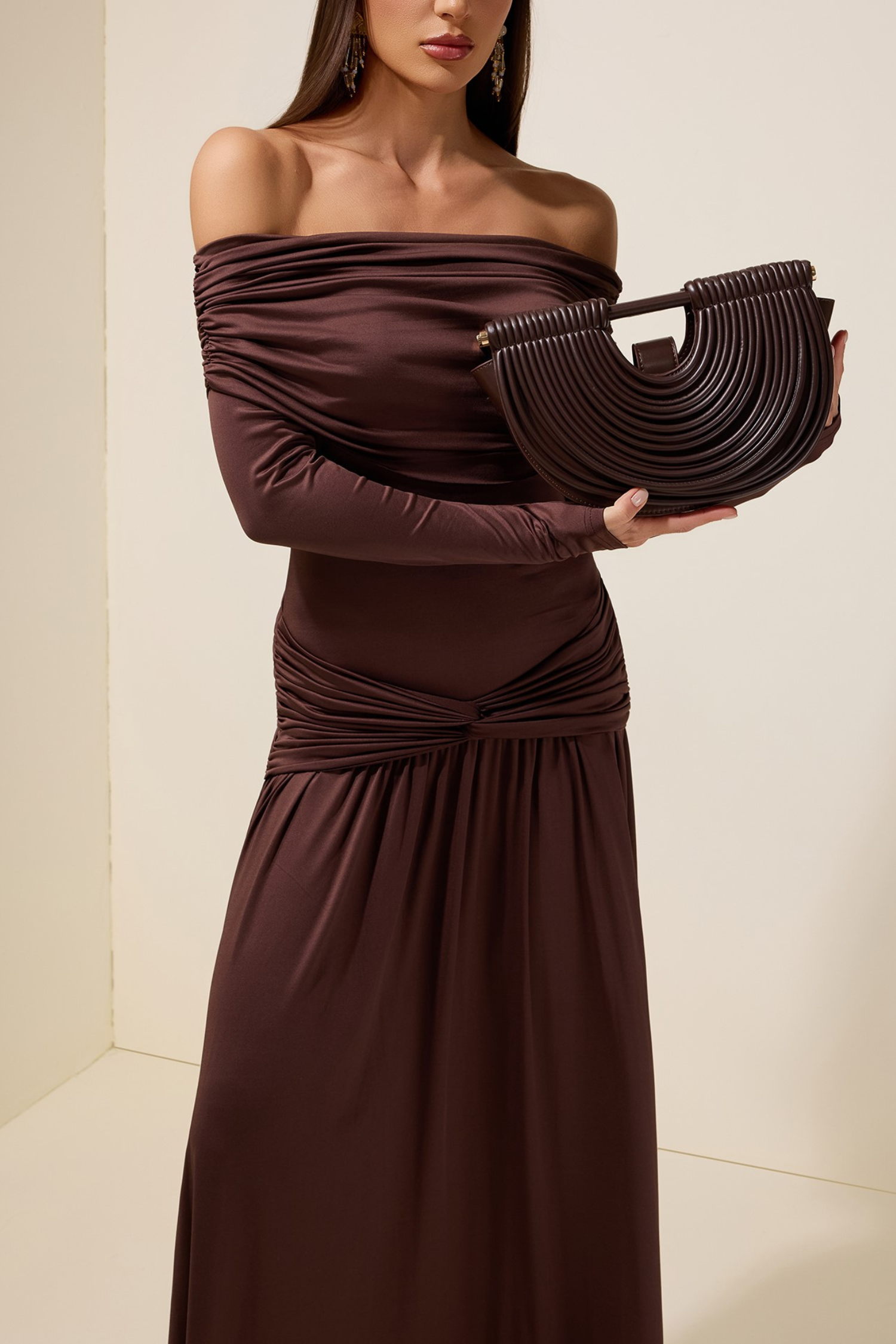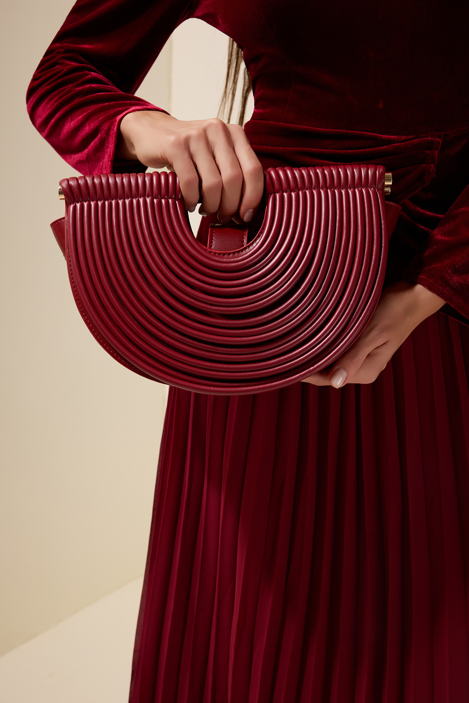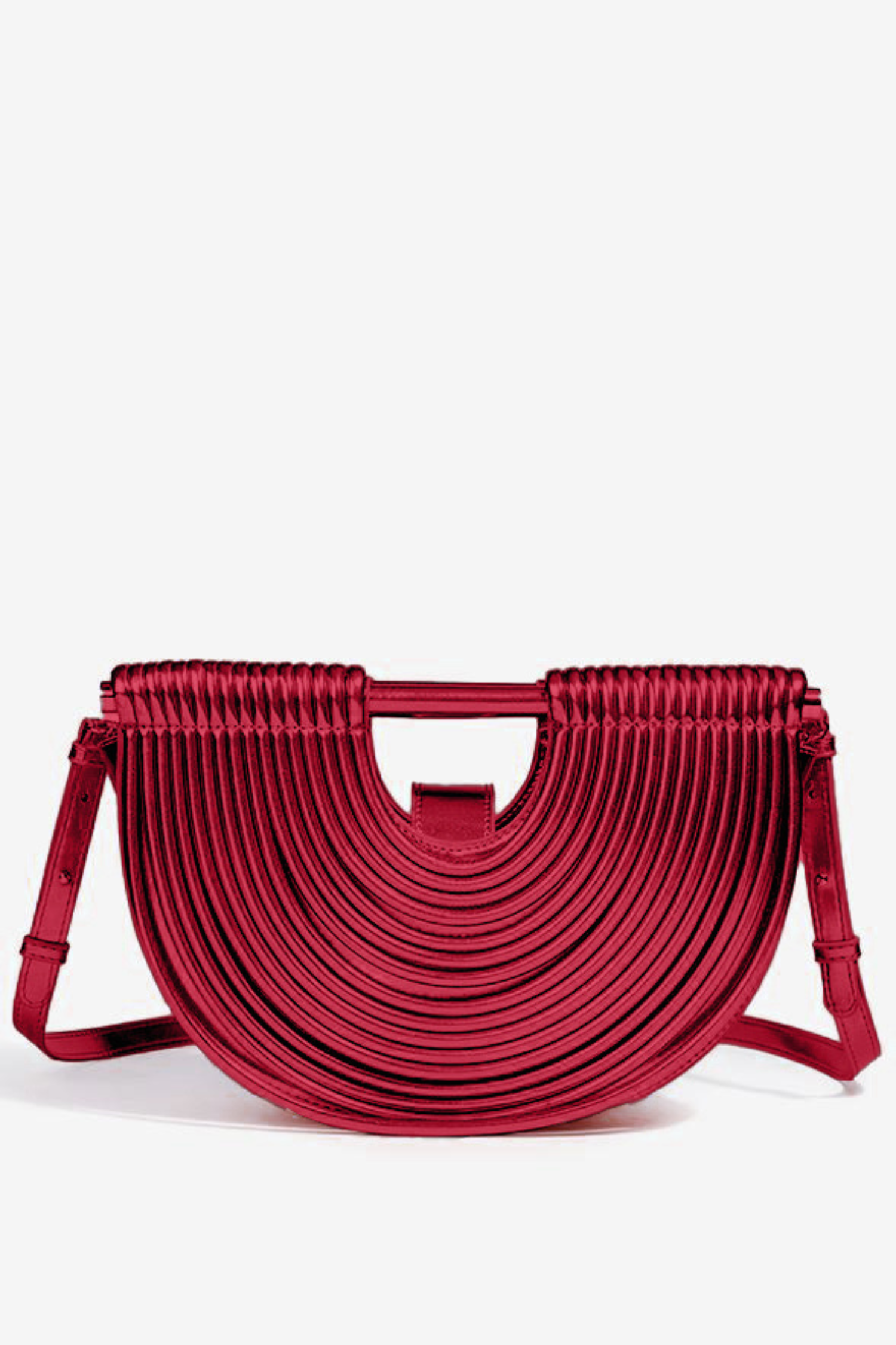 A chic semi-circular woven bag crafted from smooth PU material, blending modern structure with a textured, airy design. The curved silhouette offers a stylish, minimalist look, while the woven detailing adds depth and character. Lightweight and easy to carry, it provides enough space for your daily essentials without compromising on elegance.