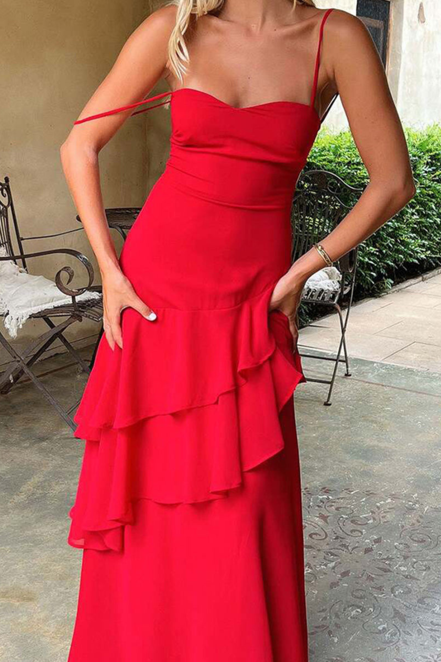 A romantic and elegant red dress designed with delicate spaghetti straps and a flattering sweetheart neckline that enhances the feminine silhouette. The slim fit is elevated with soft ruffle detailing along the side, adding movement, texture, and a touch of graceful charm. Eye-catching yet refined, this dress is made to leave a lasting impression.