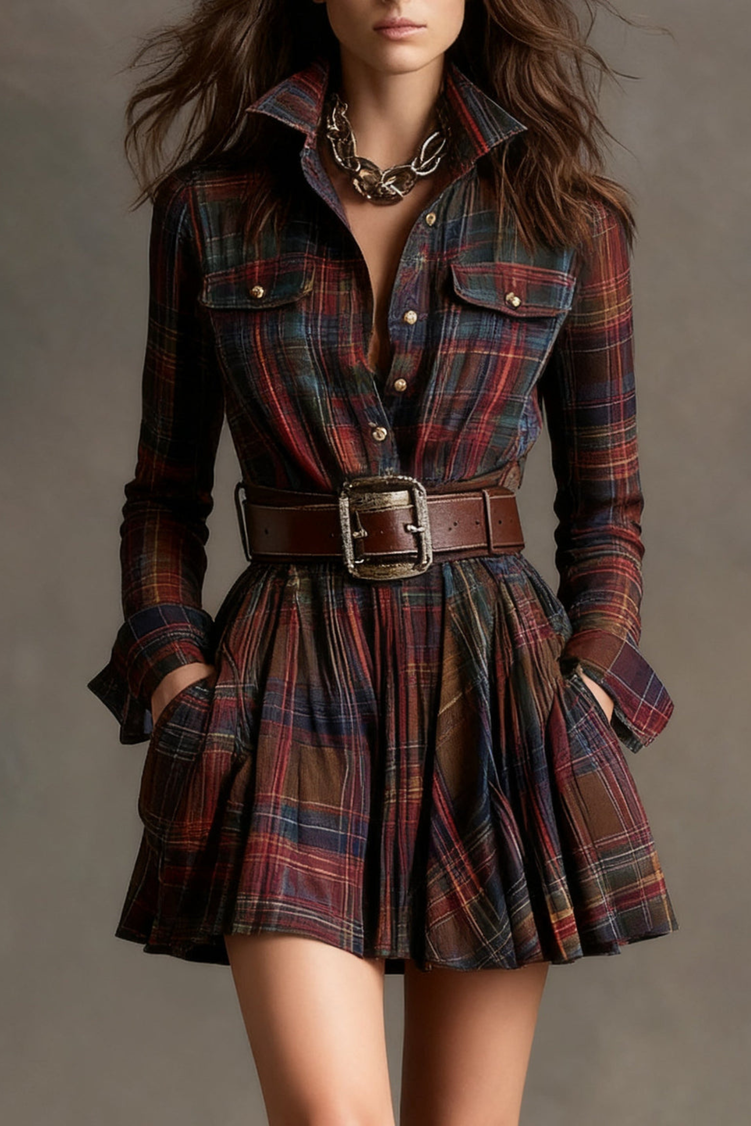A classic vintage-inspired mini dress designed with a structured lapel neckline and a timeless red and brown plaid pattern. The included belt cinches the waist beautifully, enhancing the silhouette while adding a polished, tailored touch. Stylish and versatile, this dress blends retro charm with modern elegance for an effortlessly chic look.